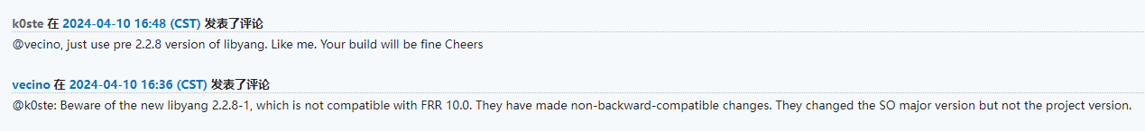 然后...frr就报找不到libyang的so库直接炸了,翻了下frr的aur发现是libyang那边又双叒叕引入了breaking change...
